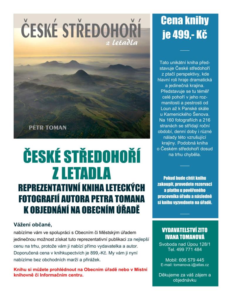 Ve spolupráci s vydavatelkou a autorem knihy "České středohoří z letadla" nabízíme tuto knihu za 499 Kč. Knihu je možno si prohlédnout na obecním úřadě.